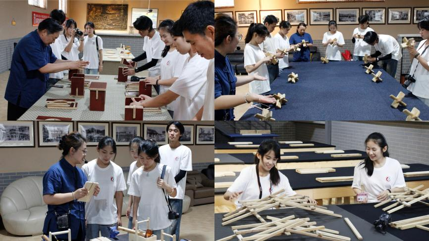 在讲解员和非遗传承人杜丕涛的引导下,实践队员依次参观鲁班厅、民俗厅、工具厅、知木堂、木匠铺、古代建桥、传统木作、现代木作、孵化创新工作室、制作区、鲁班锁、讲堂及超级工匠共十三大主题展区。队员们通过专业讲解、视频展播及沉浸式体验,结合专业所学,将多元模式融入实践环节。在“木工工具认知与体验”“传统榫卯结构体验”等技艺展示、知识问答与互动体验中,队员们深刻体悟到木作有语,一榫一卯皆蕴藏中国文化之美的含义,领略到非遗传承的价值意义。