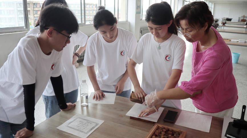 墨香千载润芳华,纸韵万卷纳乾坤。实践队员们跟随讲解老师的脚步,深刻领悟中华文明瑰宝四大发明的历史脉络与当代价值,并学习了解活字印刷和雕版印刷的运作过程,在指导下亲身体验印刷品的制作,从涂刷墨汁到拓印纸张的每一个步骤中切实感受古人蕴藏于传统技艺中的智慧光芒。