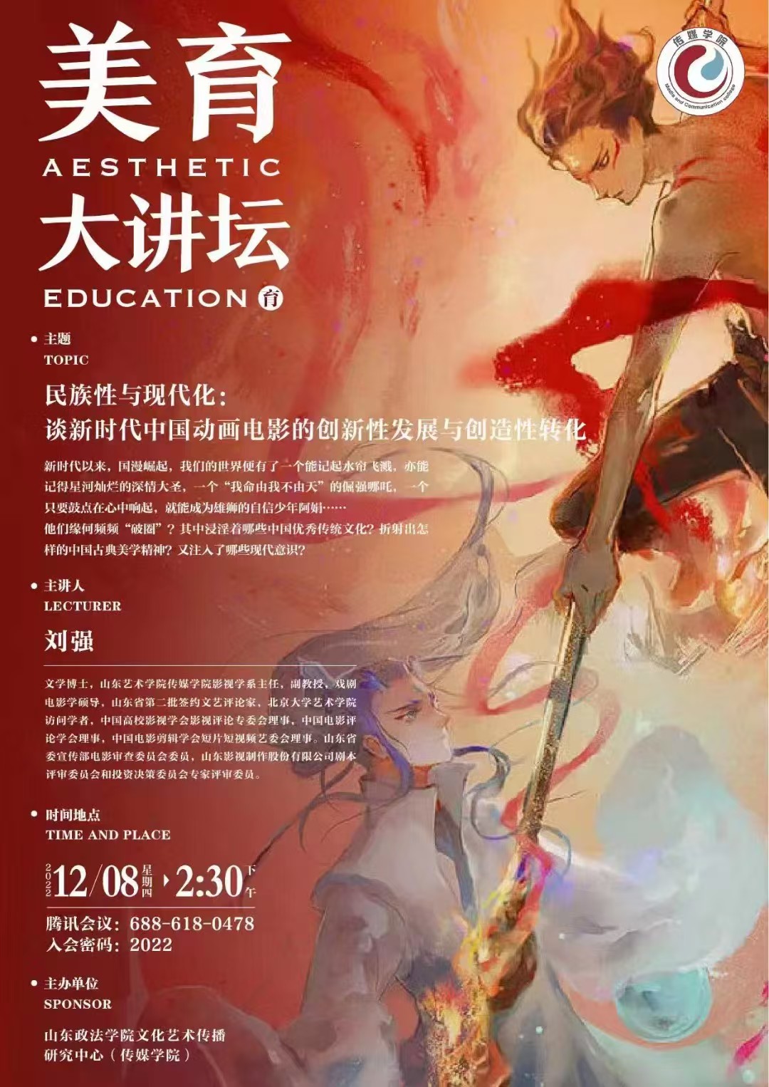 大通社讯(记者禚然飞 徐旺)12月8日下午,山东签约文艺评论家刘强以“民族性与现代化:谈新时代中国动画电影的创新性发展与创造性转化”为题做客山东政法学院美育大讲坛第29期,山东政法学院传媒学院张晶晶教授主持讲座。