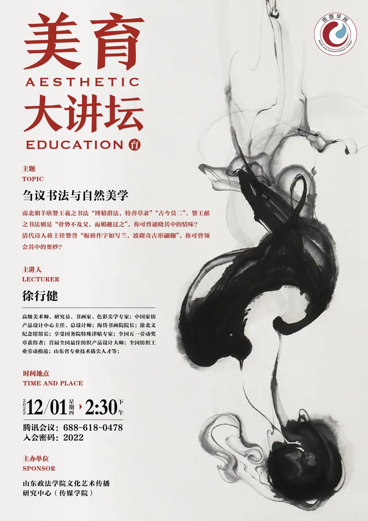 大通社讯(记者 赵乐 陈奕娇) 12月1日下午,海岱书画院院长、徐北文纪念馆馆长、高级美术师徐行健先生以“刍议书法与自然美学”为题做客山东政法学院美育大讲坛第27期,山东政法学院传媒学院教师龚天雁博士主持讲座。