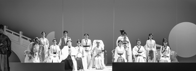 个舞台画面之中给予人物在色彩之中的留白,成为观众的在画面中的“刺点”。配乐主要是单音复调的极 简音乐类型,交杂着中西乐器的合 鸣,部分片段融入了戏曲唱段和《心 经》的吟诵,没有刻意的浪漫抒 情,倒有几分克制的铺成陪衬,提 升了人物台词道出的意境,也让观 众在音乐的回荡中品味言语之中的 意涵。