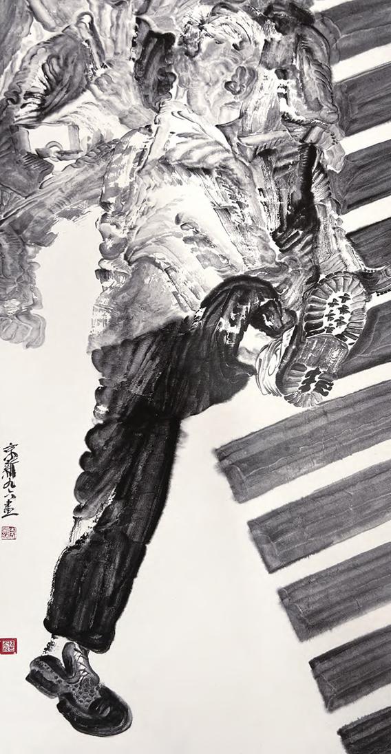 在关注人们精神层面的同时,周京新以书写的绘画方式、硬朗的笔墨在水色墨晕之中借戏曲人物来表达对现实的关切。“角色”系列用水 墨将舞台上生、旦、净、墨、丑戏剧角色的个性 展示得淋漓尽致,传统水墨画意象的刻画与传统 戏曲人物的结合可谓珠联璧合,两种不同领域的 艺术在固有传统文化的背景下,笔墨线条与戏曲 形象的相互影响,从舞台走进画面,大有戏如人 生、人生如戏的哲学意味。《大步走》《闲人系 列》《羽人系列》画面构图生猛奇险,人物形态 均处在极不安定的状态,羽人诡异,造型透明, 大步行走的人物与闲人漫游、形态各异的姿态: 眺的、躺的、笑的、怒的、打太极的、闭目养神 的、无聊看手机的……无声的水墨图像符号为观 众静静述说人生百态。这些人物水墨画,显示出 周京新大胆地借用“表现主义绘画”手法,使水 墨画用笔“力透纸背”或“润物细无声”的特质, 在有形无迹、虚中蕴实、通透淋漓的水墨之间, 将画家的心绪充分释放了出来。