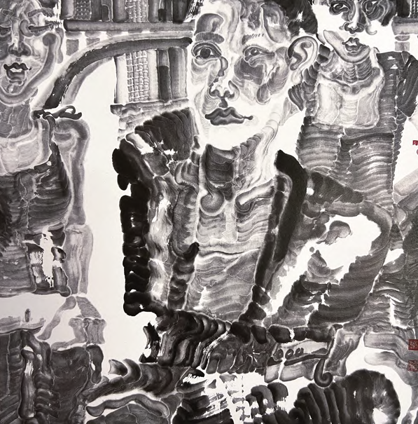 中国画追求写意,对于造型讲究“以形写神” “似与不似之间”,但笔墨形式上的写意与人物 内在造型的严谨并不冲突。从技术层面讲,水墨 人物画难画,难在以水墨来表现人物的形态和人 物的神态上。学院派出身的周京新练就了扎实的 绘画功底、准确的造型能力。他在20世纪八九十 年代即学习工笔画,因而对各种线条的应用十分 自如,到了90年代中后期,他试图将书法用笔之 法运用于水墨人物写意画中。正因为他有了多年 深厚的积淀,努力取百家之长,冲破束缚创新中 国画的条条框框,才使得用笔更加自由,摒弃了 用笔的窠臼。他把点、线、面看作中国画笔墨中 的有机零部件,根据创作需要进行自由组合,让 点、线、面融为一体,将书写性与雕塑感结合起 来,尽可能用笔墨语言本身去表现人物,从而形 成他具有个人风格的“水墨雕塑”绘画语言。